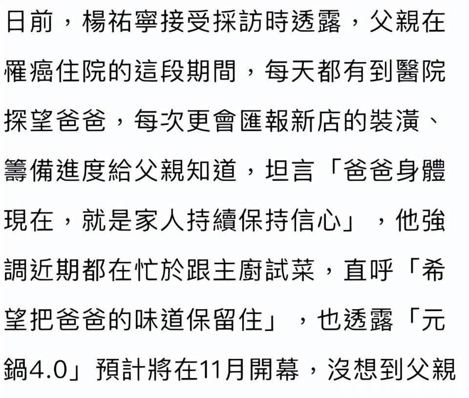 于是就在台湾开了一家名叫“元锅”的火锅店,因为卫生干净,用料实诚,价格公道,味道好,再加上有杨祐宁的名气作担保,这家火锅店生意一直很好。老两口也乐得在生意忙忙碌碌,但凡自己能做的的,就不劳他人帮忙。今年6月,杨祐宁的父亲杨进元突然感到身体隐隐有些不适。