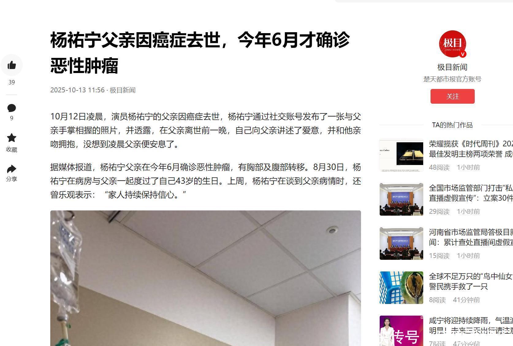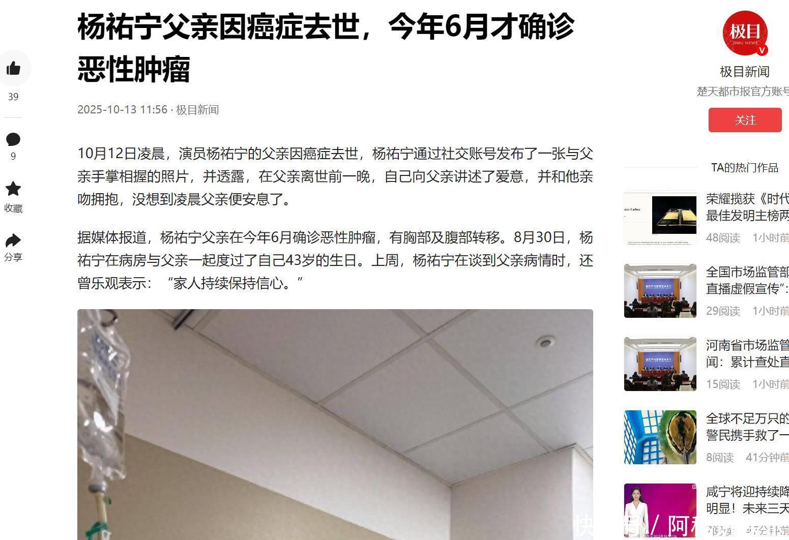 参考文献极目新闻,杨祐宁父亲因癌症去世,今年6月才确诊恶性肿瘤